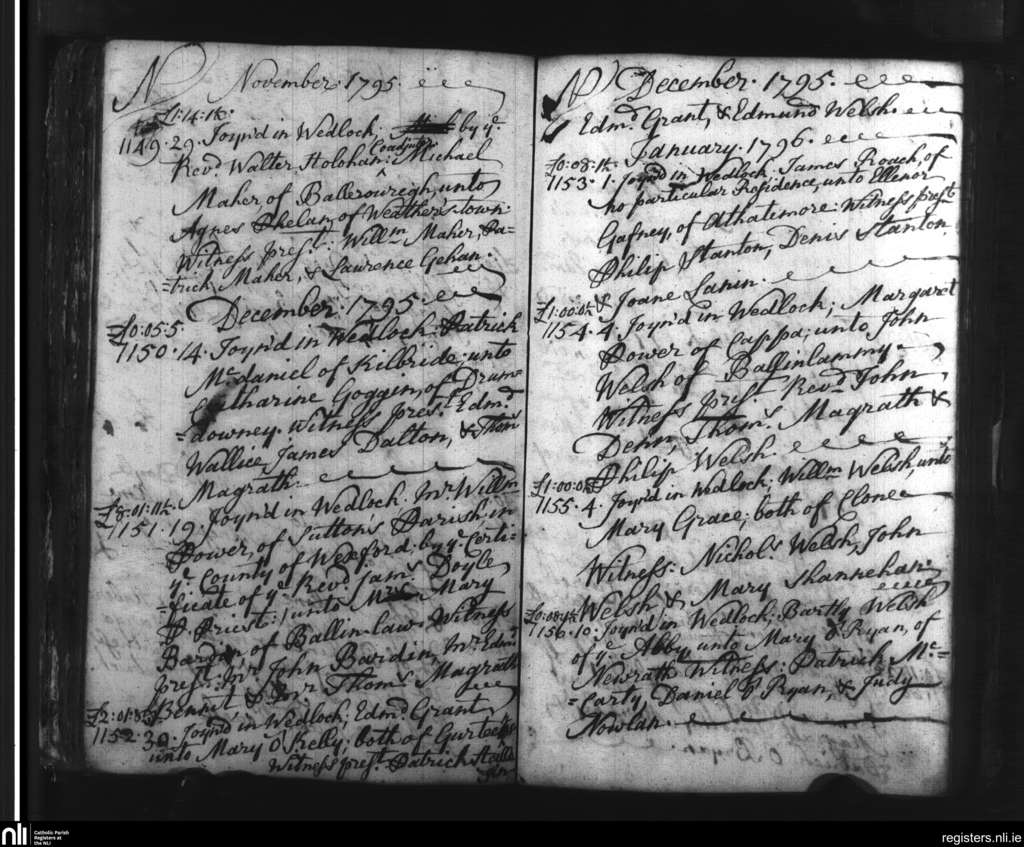 Slieverue; County of Waterford, Kilkenny; Diocese of Ossory. Marriages, Nov. 1795 to Jan. 1796