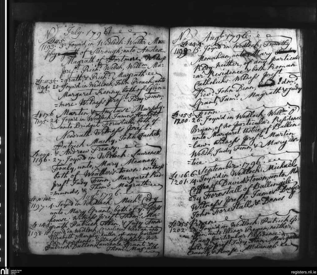 Slieverue; County of Waterford, Kilkenny; Diocese of Ossory. Marriages, July 1796 to Sep. 1796