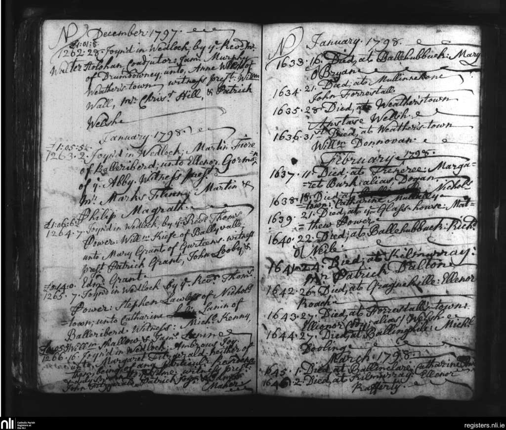 Slieverue; County of Waterford, Kilkenny; Diocese of Ossory. Marriages, Deaths, Dec. 1797 to Mar. 1798