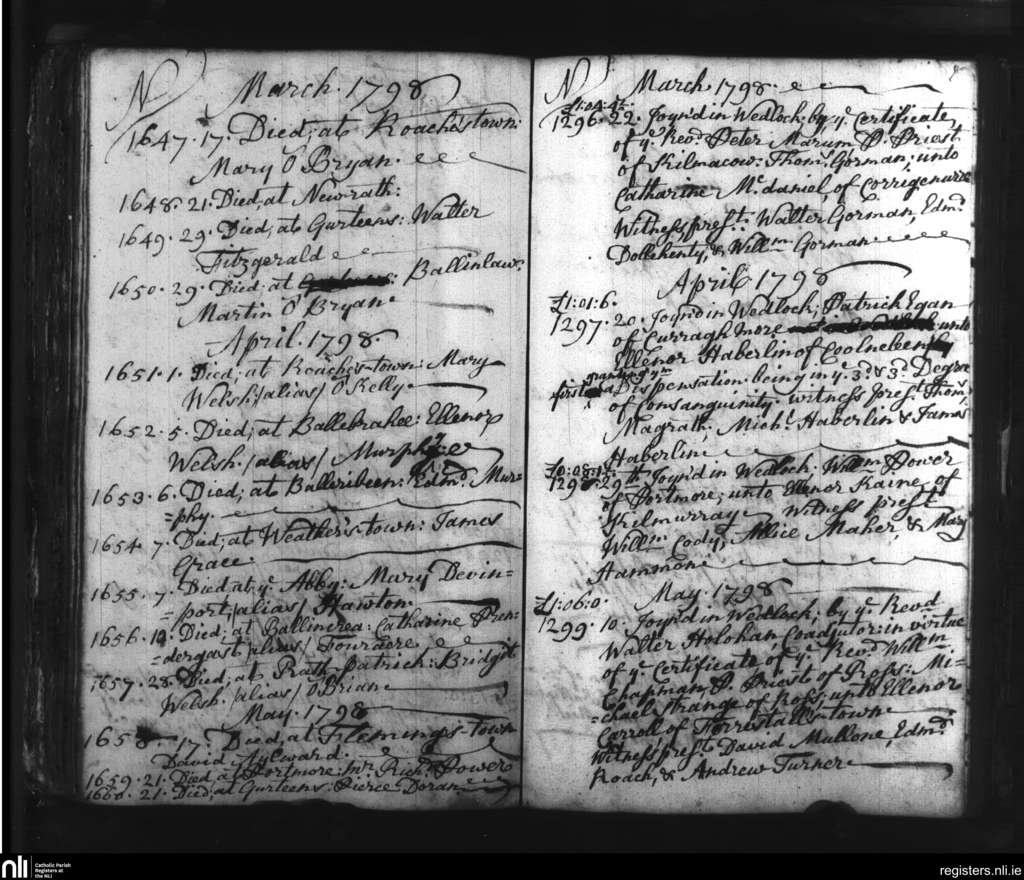Slieverue; County of Waterford, Kilkenny; Diocese of Ossory. Marriages, Deaths, Mar. 1798 to May 1798