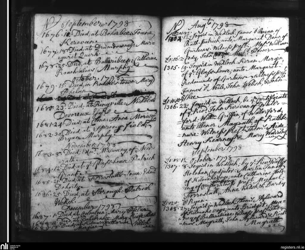 Slieverue; County of Waterford, Kilkenny; Diocese of Ossory. Marriages, Deaths, Aug. 1798 to Dec. 1798
