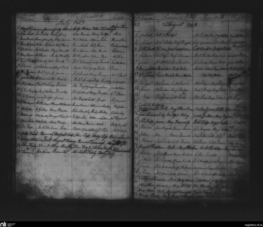 Thomastown; County of Kilkenny; Diocese of Ossory. Baptisms, July 1843 to Aug. 1843