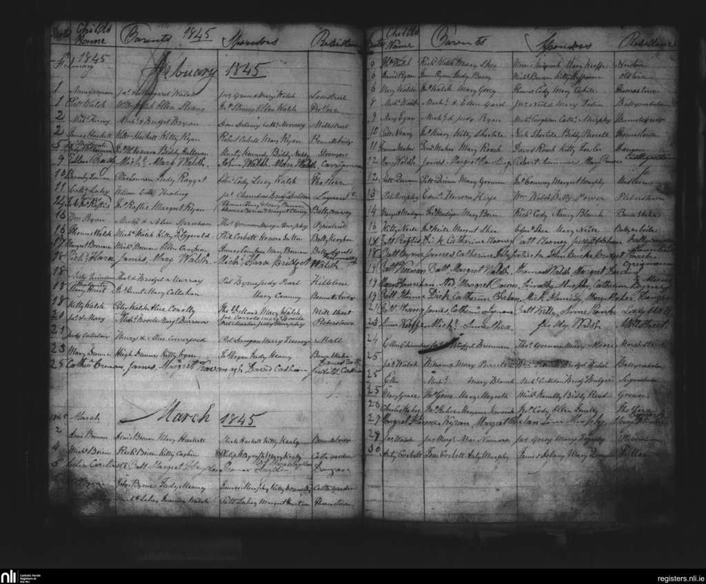 Thomastown; County of Kilkenny; Diocese of Ossory. Baptisms, Feb. 1845 to Mar. 1845