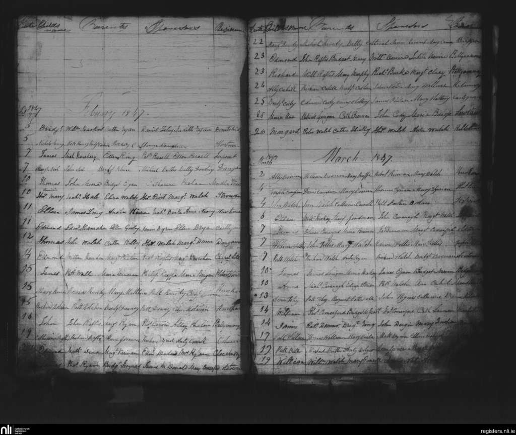 Thomastown; County of Kilkenny; Diocese of Ossory. Baptisms, Jan. 1847 to Mar. 1847