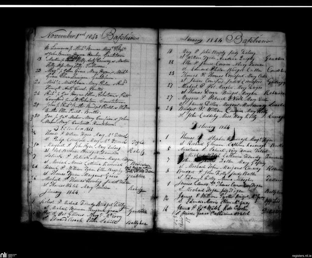 Tullaroan; County of Kilkenny; Diocese of Ossory. Baptisms, Nov. 1843 to Feb. 1844