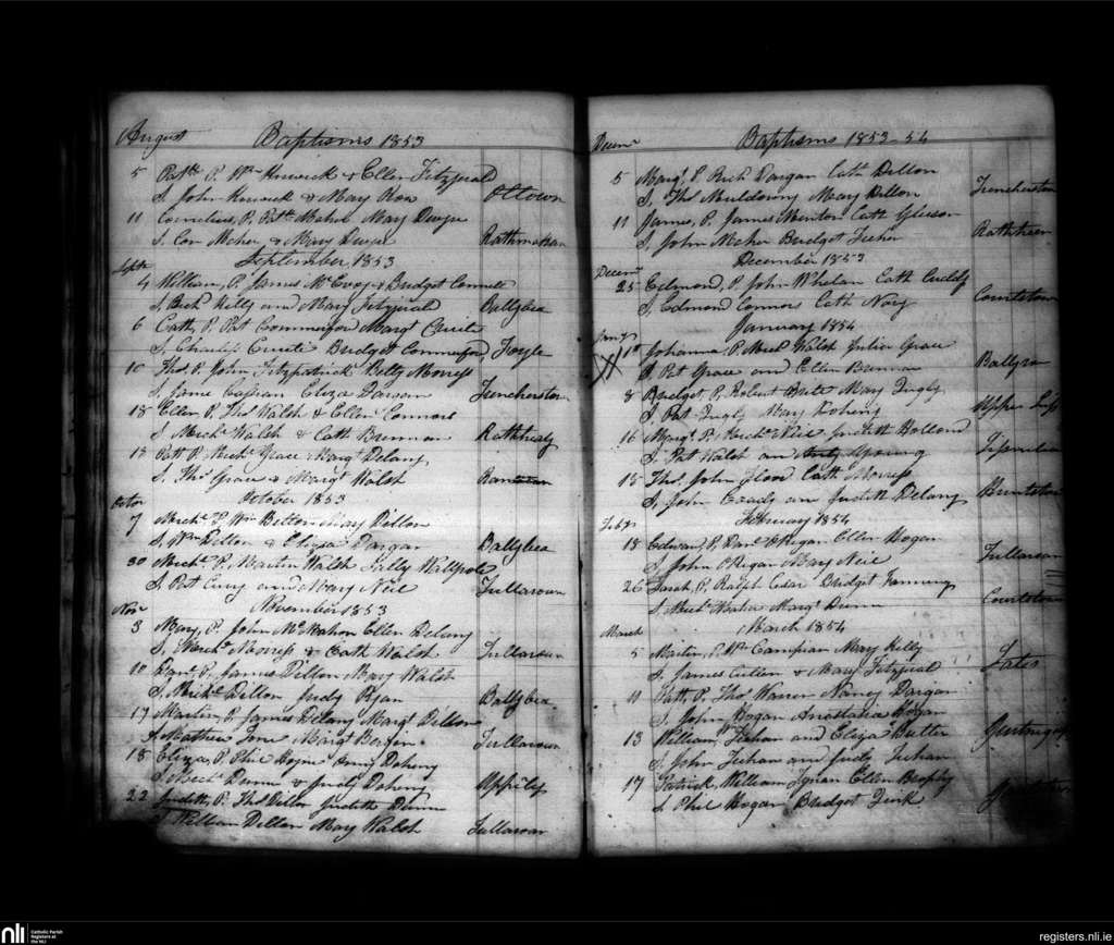 Tullaroan; County of Kilkenny; Diocese of Ossory. Baptisms, Aug. 1853 to Mar. 1854