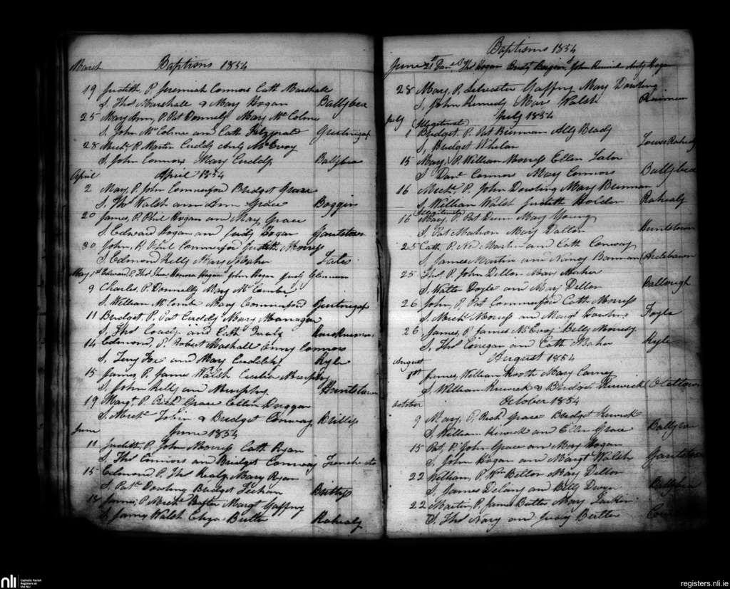 Tullaroan; County of Kilkenny; Diocese of Ossory. Baptisms, Mar. 1854 to Oct. 1854