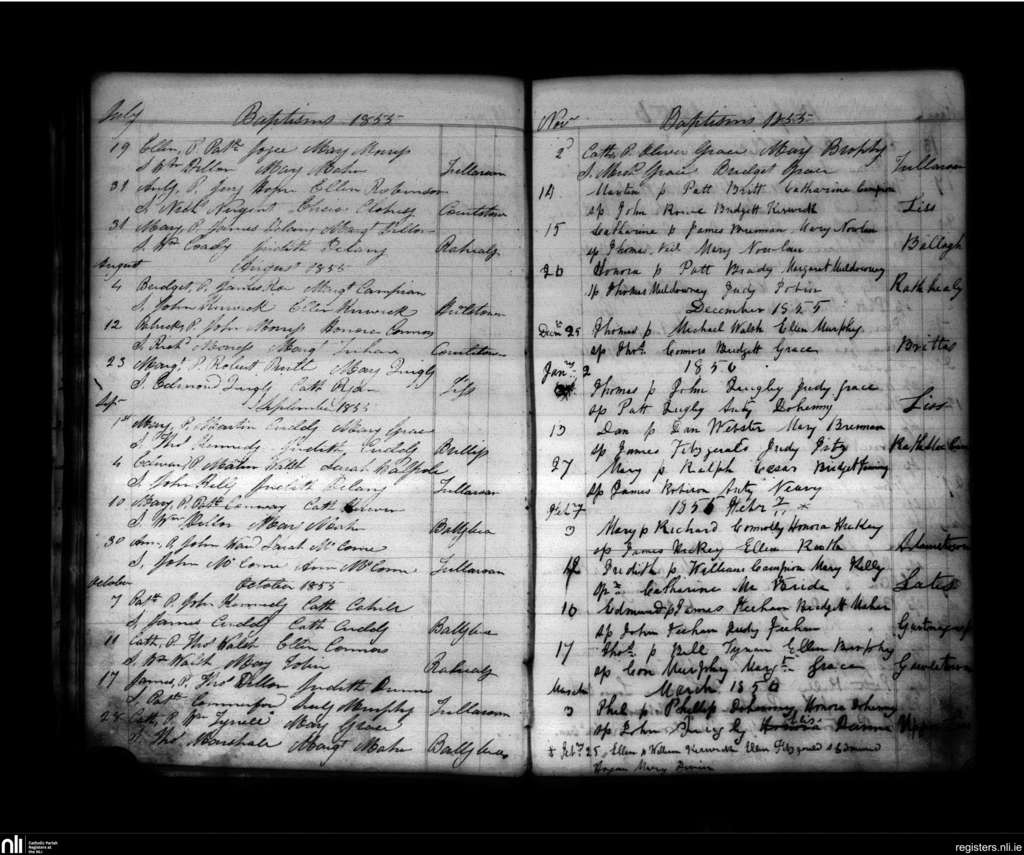 Tullaroan; County of Kilkenny; Diocese of Ossory. Baptisms, July 1855 to Mar. 1856