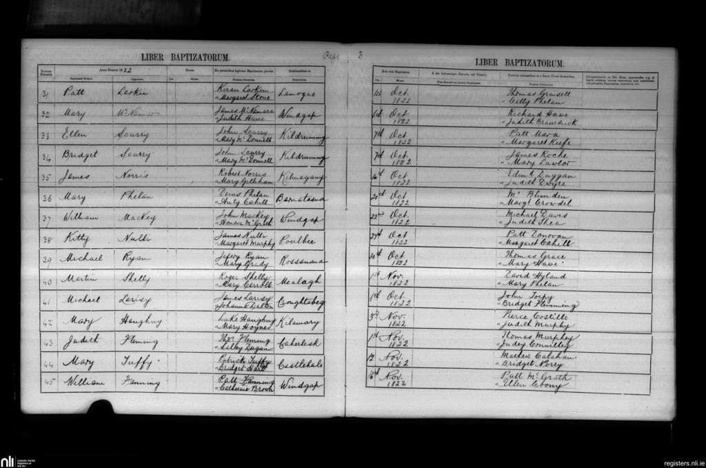 Windgap; County of Kilkenny; Diocese of Ossory. Baptisms, Oct. 1822 to Nov. 1822