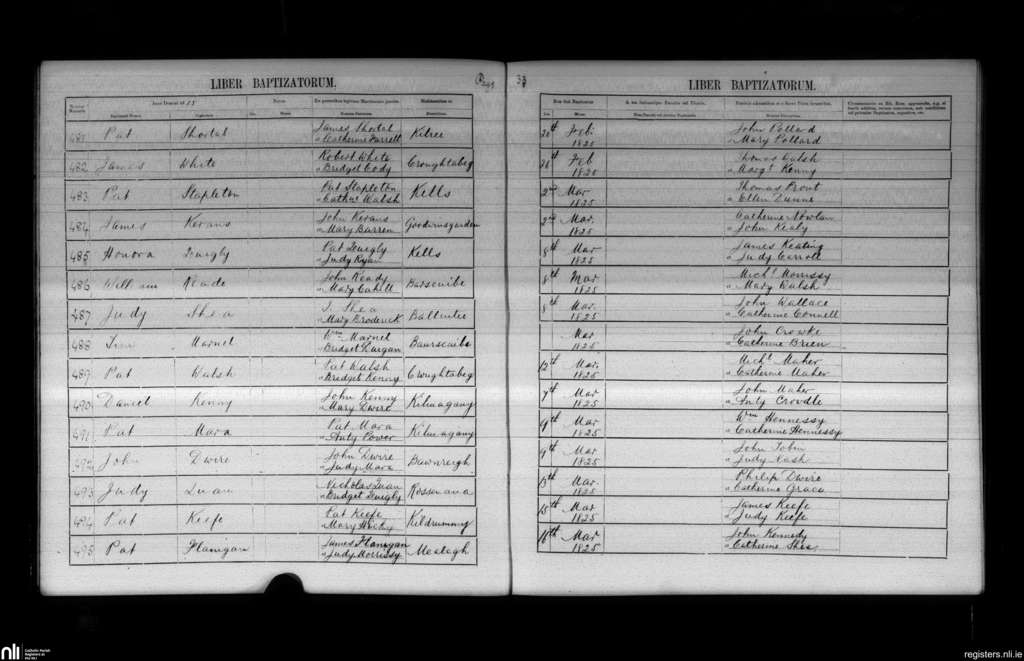 Windgap; County of Kilkenny; Diocese of Ossory. Baptisms, Feb. 1825 to Mar. 1825