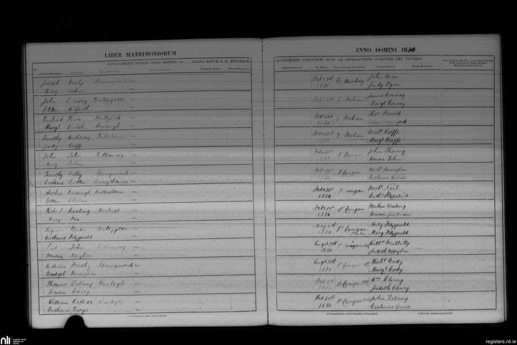 Windgap; County of Kilkenny; Diocese of Ossory. Marriages, Feb. 1830 to Oct. 1830