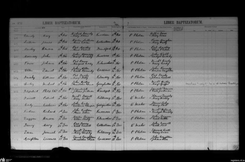 Windgap; County of Kilkenny; Diocese of Ossory. Baptisms, Oct. 1870 to Dec. 1870