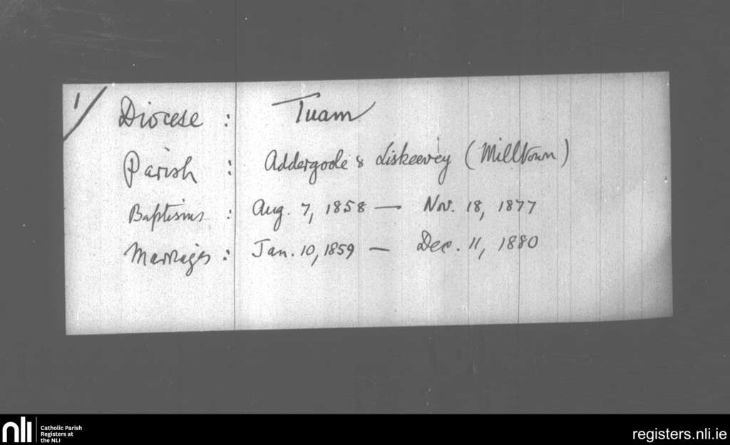 Addergoole and Liskeevy; County of Galway; Archdiocese of Tuam. Baptisms, Marriages