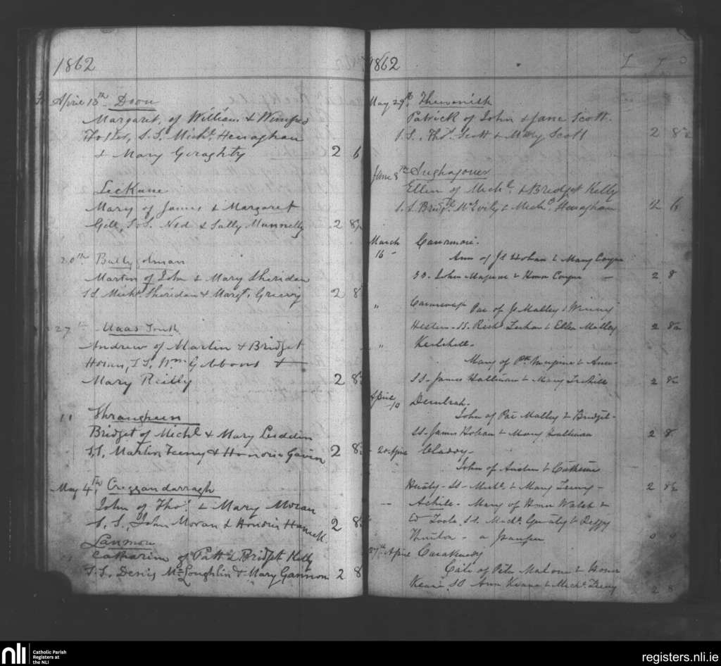 Aughagower; County of Mayo; Archdiocese of Tuam. Baptisms, Mar. 1862 to June 1862