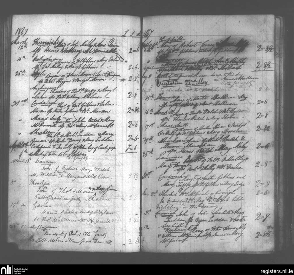 Aughagower; County of Mayo; Archdiocese of Tuam. Baptisms, Marriages, Mar. 1867 to Dec. 1911