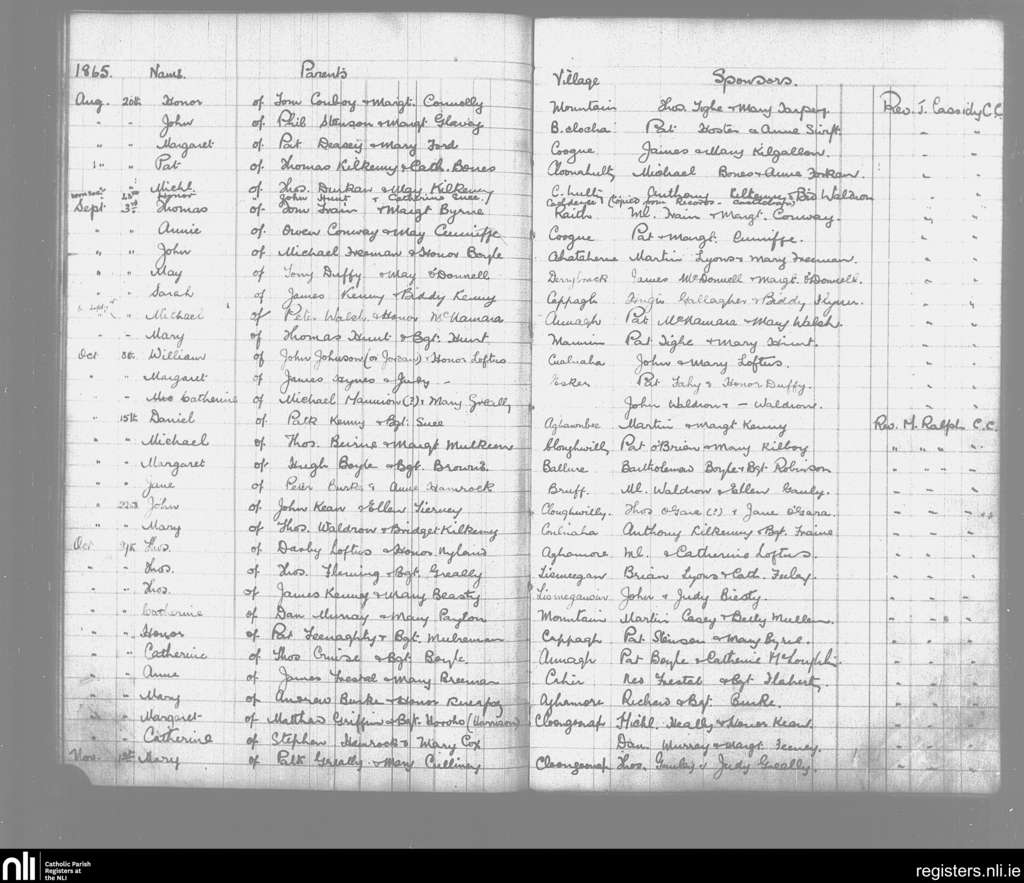 Aghamore; County of Mayo; Archdiocese of Tuam. Baptisms, Aug. 1865 to Nov. 1865