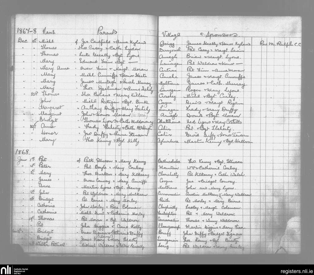Aghamore; County of Mayo; Archdiocese of Tuam. Baptisms, Dec. 1867 to Jan. 1868