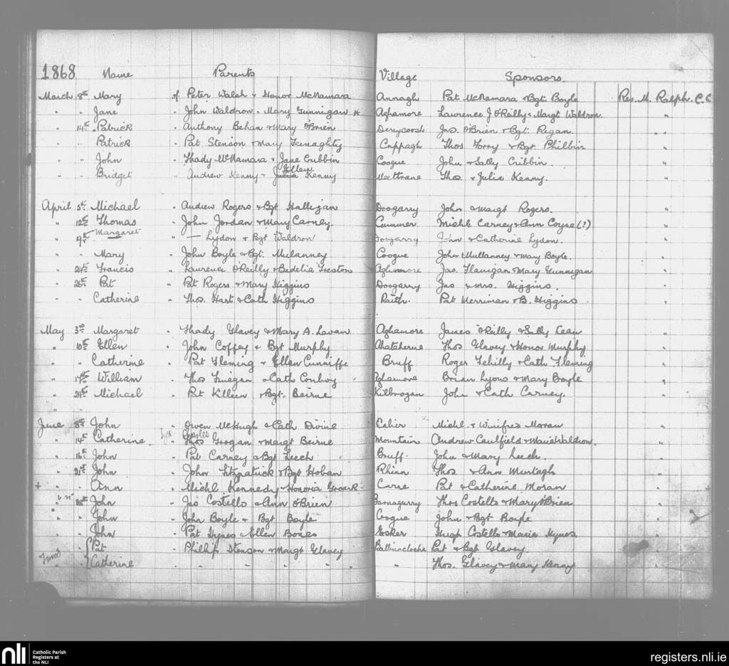 Aghamore; County of Mayo; Archdiocese of Tuam. Baptisms, Mar. 1868 to June 1868