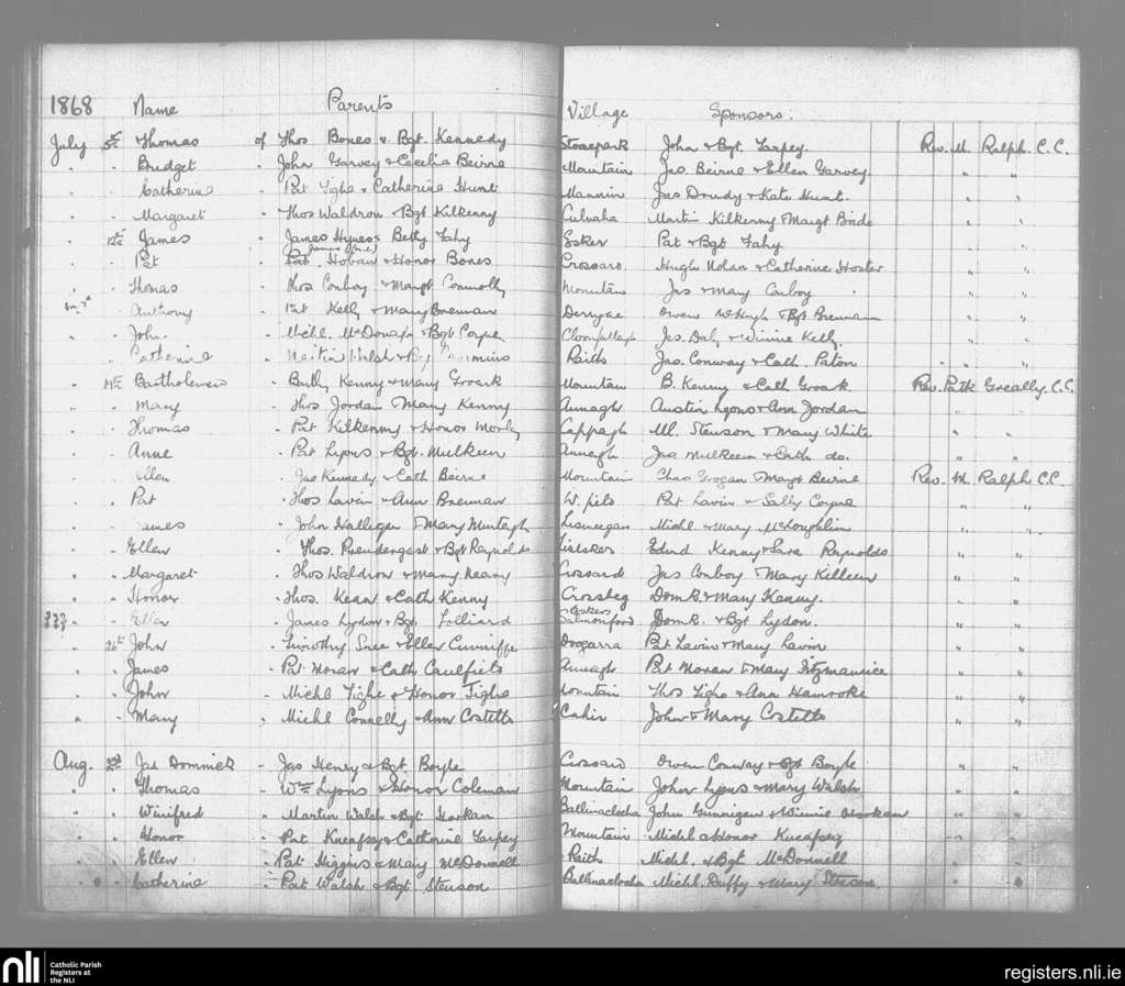 Aghamore; County of Mayo; Archdiocese of Tuam. Baptisms, July 1868 to Aug. 1868