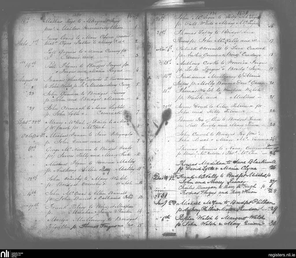 Castlebar; County of Mayo; Archdiocese of Tuam. Marriages, June 1830 to Jan. 1831