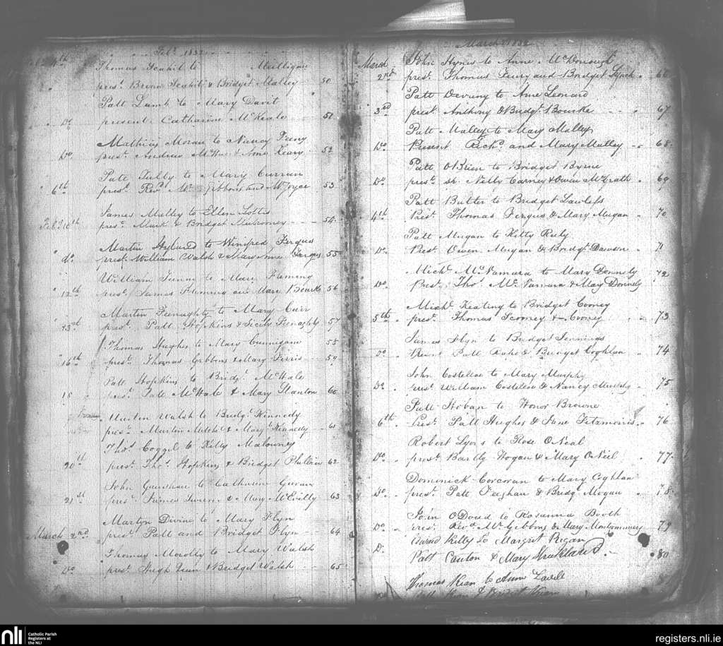 Castlebar; County of Mayo; Archdiocese of Tuam. Marriages, Feb. 1832 to Mar. 1832