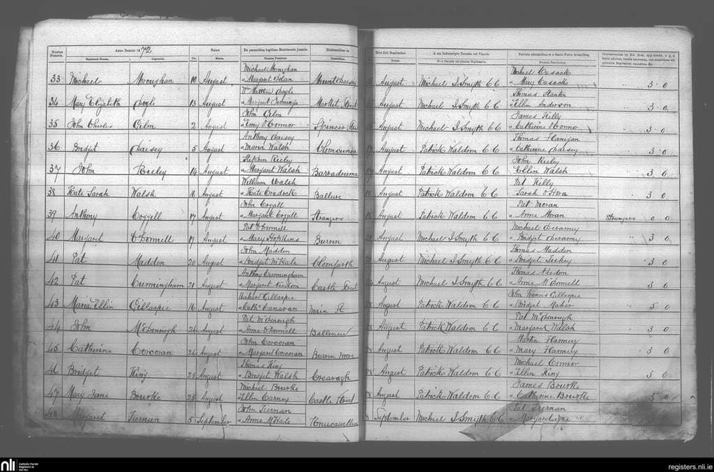 Castlebar; County of Mayo; Archdiocese of Tuam. Baptisms, Aug. 1872 to Sep. 1872