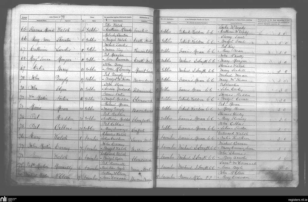 Castlebar; County of Mayo; Archdiocese of Tuam. Baptisms, Oct. 1872 to Nov. 1872