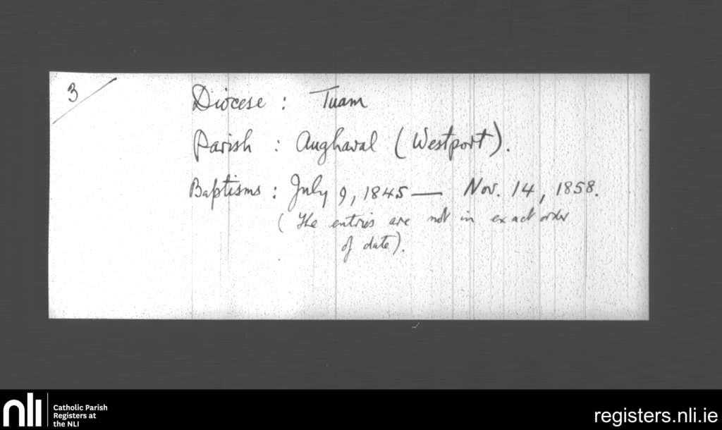 Aughaval; County of Mayo; Archdiocese of Tuam. Baptisms