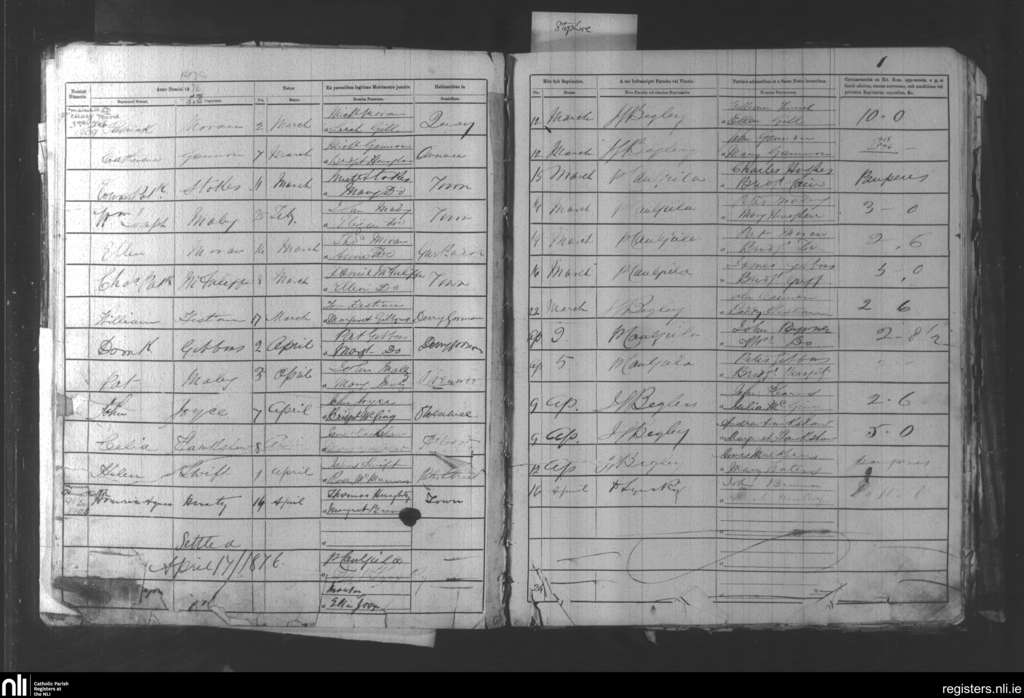 Aughaval; County of Mayo; Archdiocese of Tuam. Baptisms, Mar. 1876 to Apr. 1876