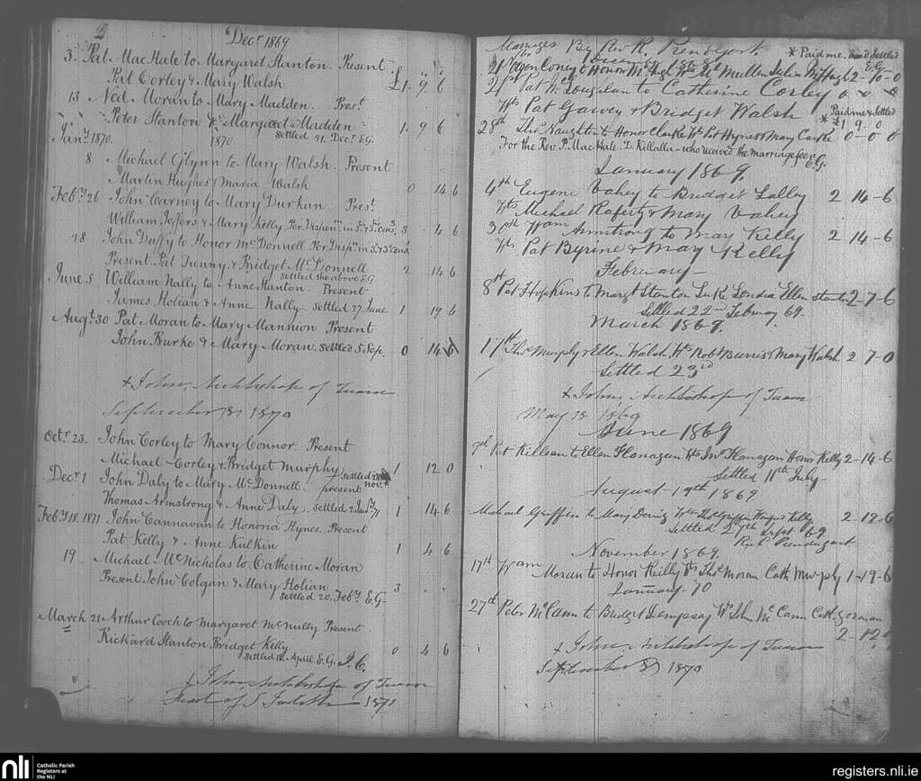 Balla; County of Mayo; Archdiocese of Tuam. Marriages, Dec. 1868 to Mar. 1871