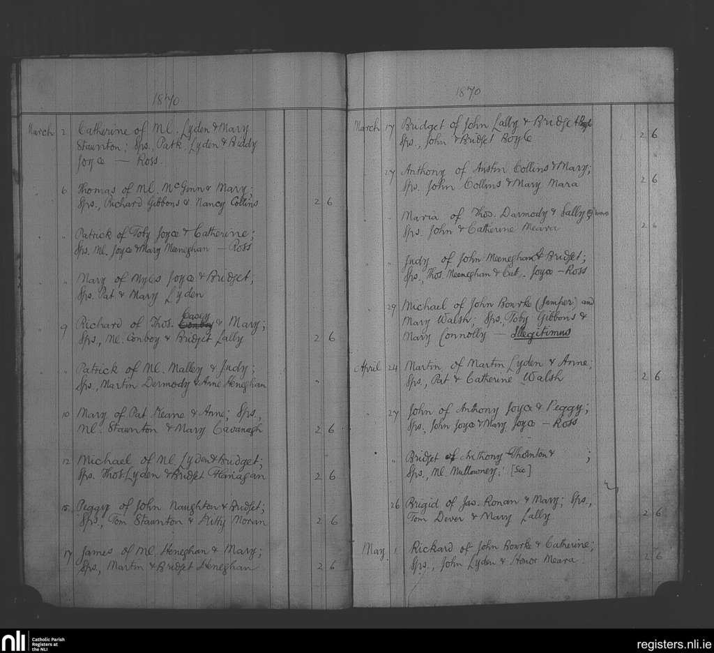 Tourmakeady; County of Mayo; Archdiocese of Tuam. Baptisms, Mar. 1870 to May 1870