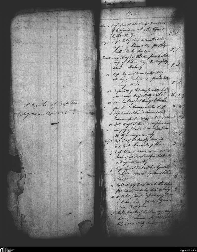 Clountead, Ballingarry and Ballymartle; County of Cork; Diocese of Cork and Ross. Baptisms, Apr. 1836 to July 1836