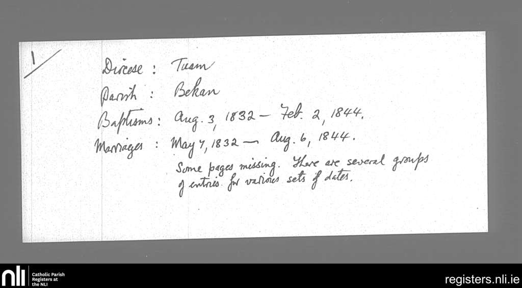 Bekan; County of Mayo; Archdiocese of Tuam. Baptisms, Marriages