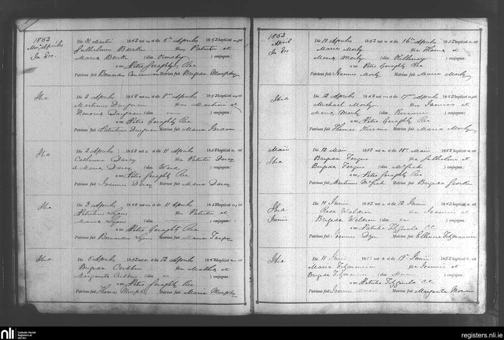 Bekan; County of Mayo; Archdiocese of Tuam. Baptisms, Apr. 1852 to June 1852