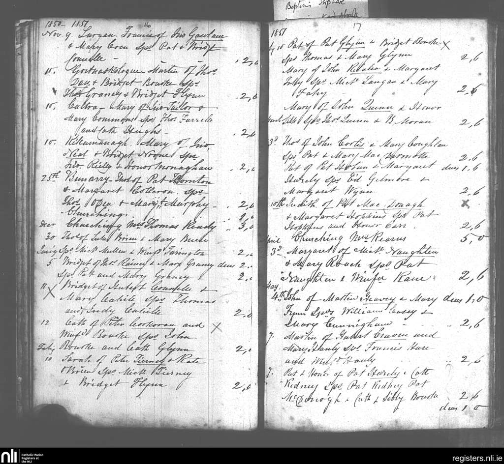 Donaghpatrick; County of Galway; Archdiocese of Tuam. Baptisms, Nov. 1850 to May 1851