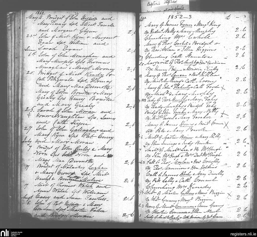 Donaghpatrick; County of Galway; Archdiocese of Tuam. Baptisms, May 1852 to Apr. 1853