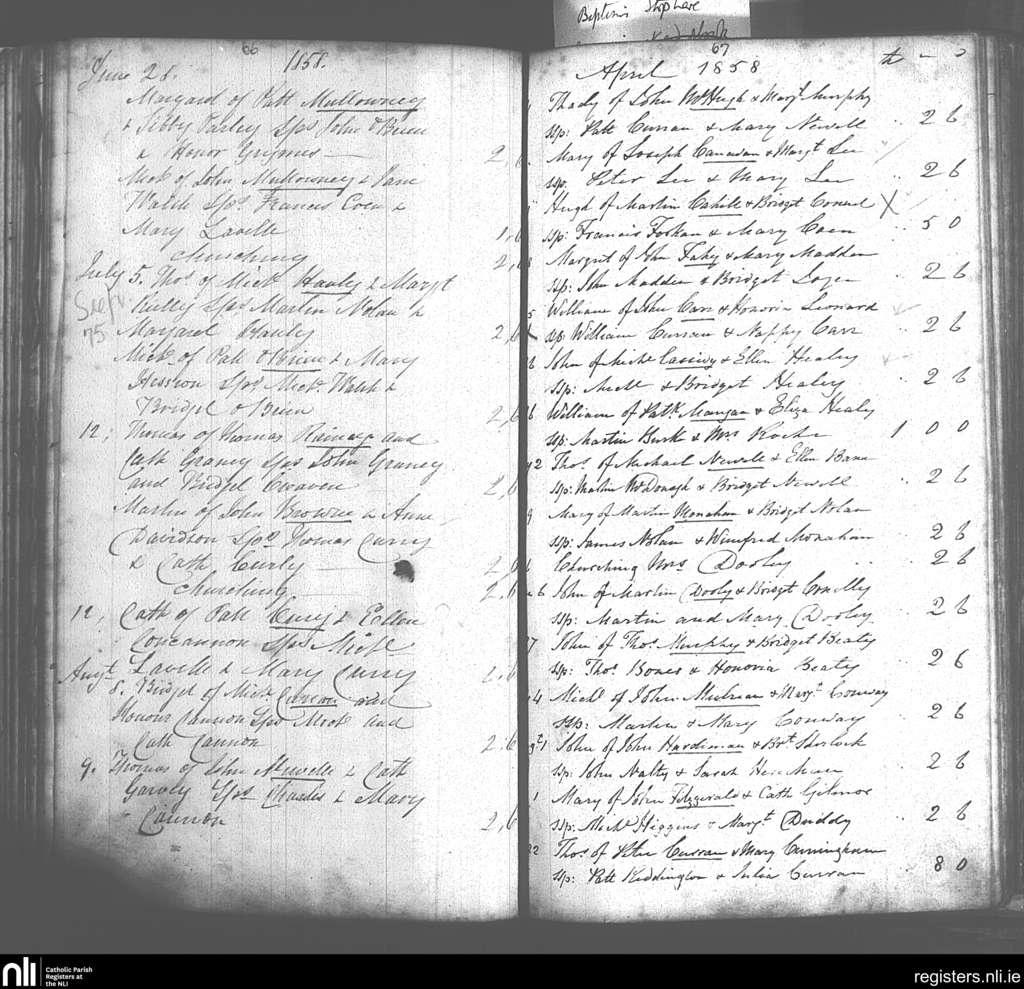 Donaghpatrick; County of Galway; Archdiocese of Tuam. Baptisms, Apr. 1858 to Aug. 1858