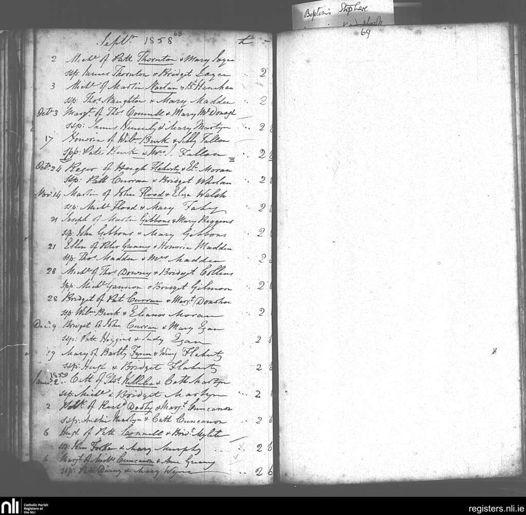 Donaghpatrick; County of Galway; Archdiocese of Tuam. Baptisms, Sep. 1858 to Jan. 1859