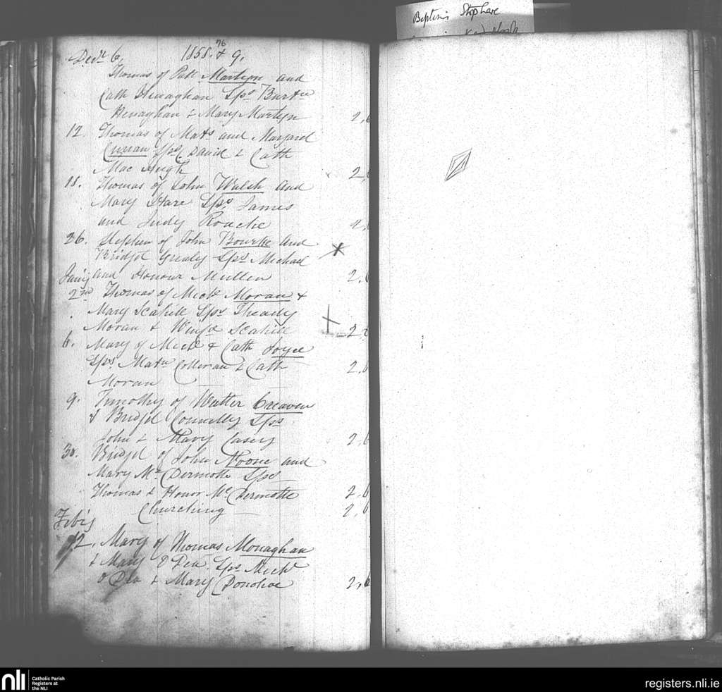 Donaghpatrick; County of Galway; Archdiocese of Tuam. Baptisms, Dec. 1858 to Feb. 1859