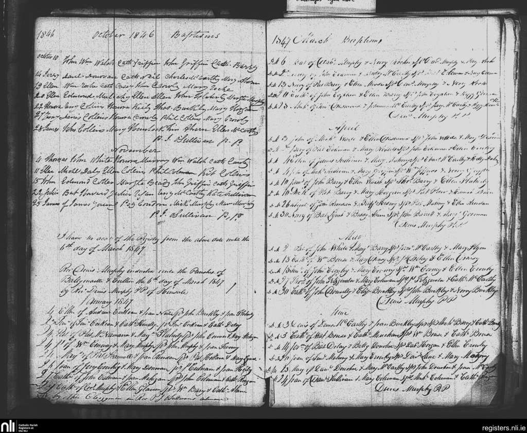 Clountead, Ballingarry and Ballymartle; County of Cork; Diocese of Cork and Ross. Baptisms, Oct. 1846 to June 1847