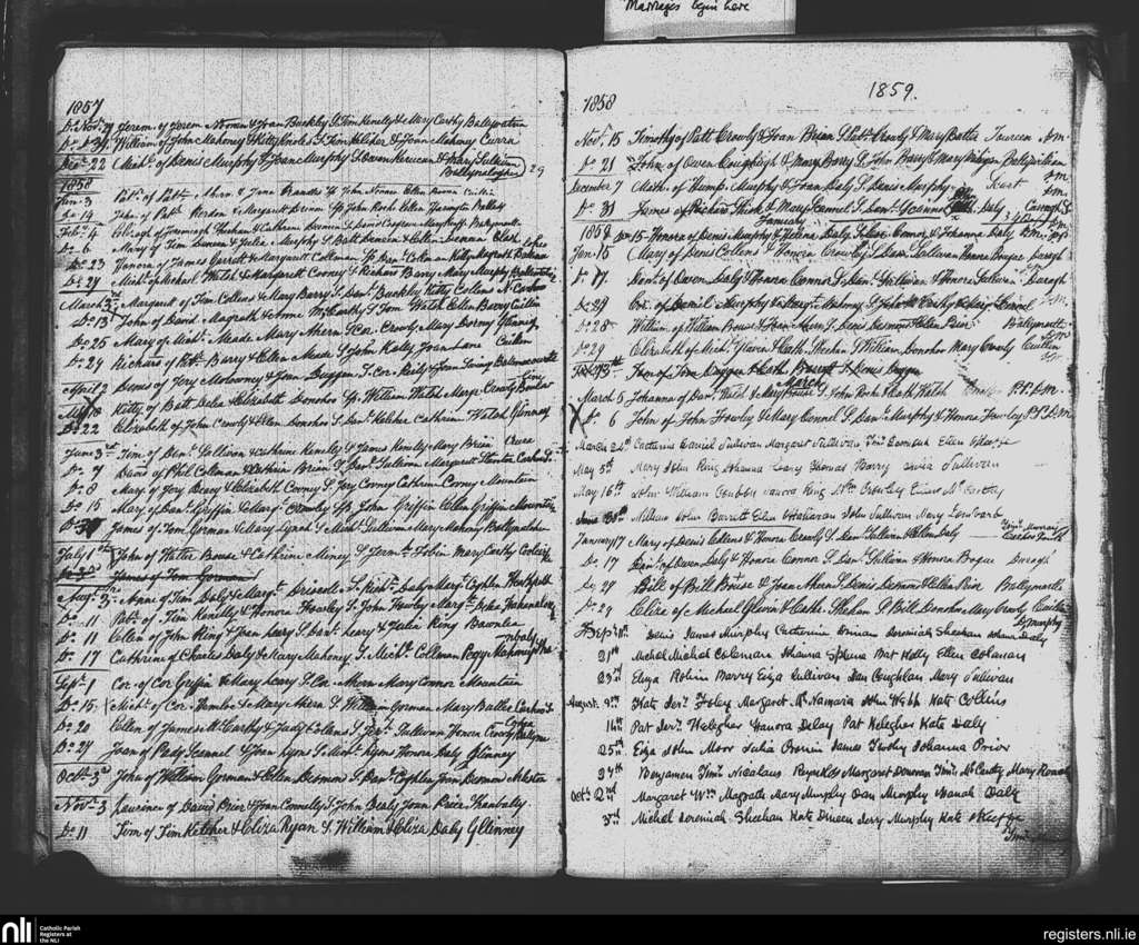 Clountead, Ballingarry and Ballymartle; County of Cork; Diocese of Cork and Ross. Baptisms, Nov. 1857 to Oct. 1859