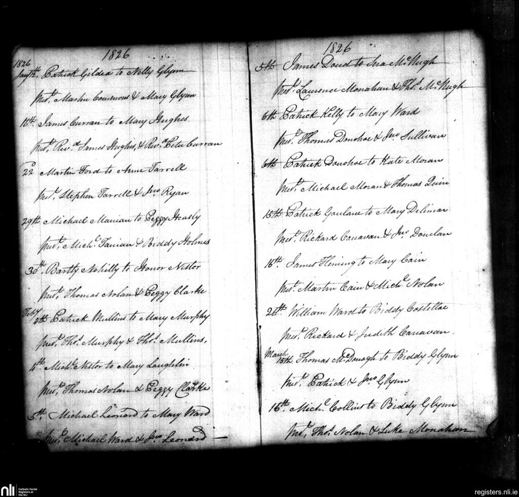 Kilmoylan; County of Galway; Archdiocese of Tuam. Marriages, Jan. 1826 to Mar. 1826