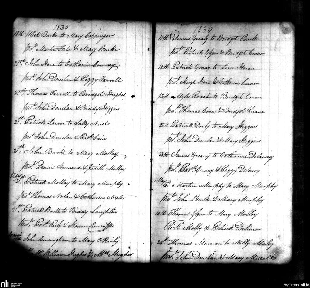 Kilmoylan; County of Galway; Archdiocese of Tuam. Marriages, Feb. 1830 to May 1830