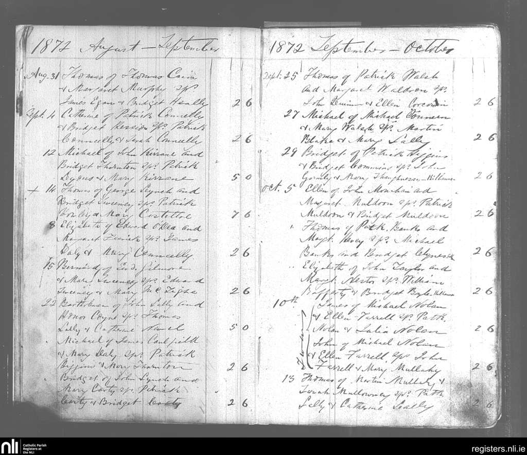 Kilconly; County of Galway; Archdiocese of Tuam. Baptisms, Aug. 1872 to Oct. 1872