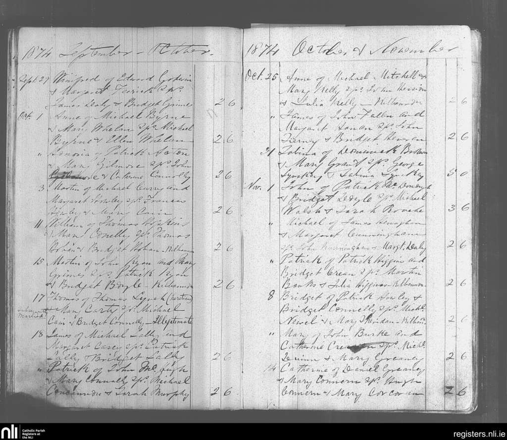 Kilconly; County of Galway; Archdiocese of Tuam. Baptisms, Sep. 1874 to Nov. 1874