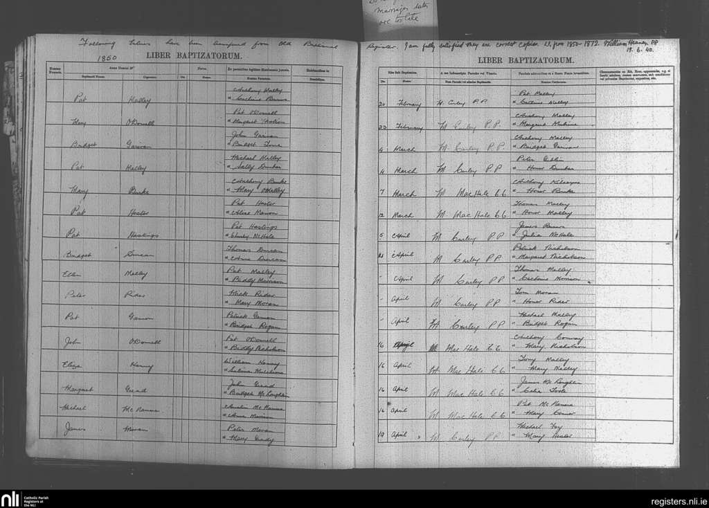 Kilgeever; County of Mayo; Archdiocese of Tuam. Baptisms, Feb. 1850 to Apr. 1850