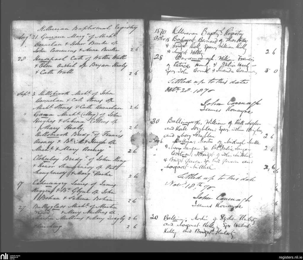 Killereran; County of Galway; Archdiocese of Tuam. Baptisms, Aug. 1870 to Nov. 1870