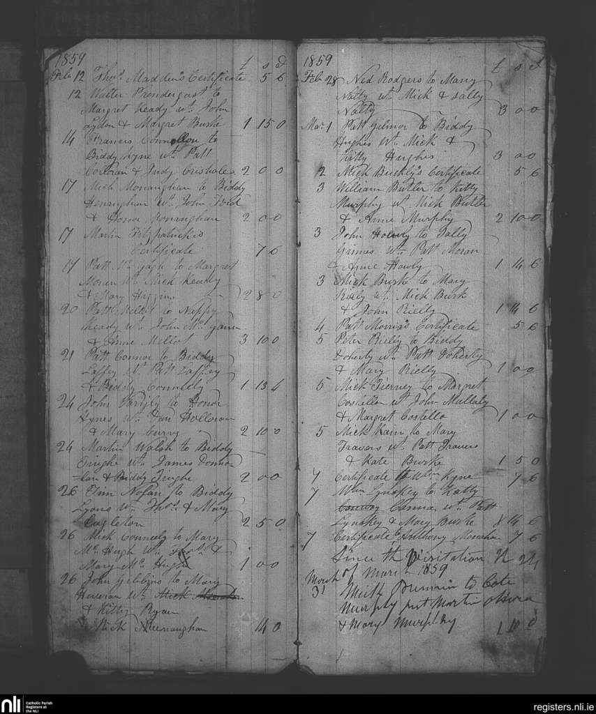 Kilmaine; County of Mayo; Archdiocese of Tuam. Marriages, Feb. 1859 to Mar. 1859