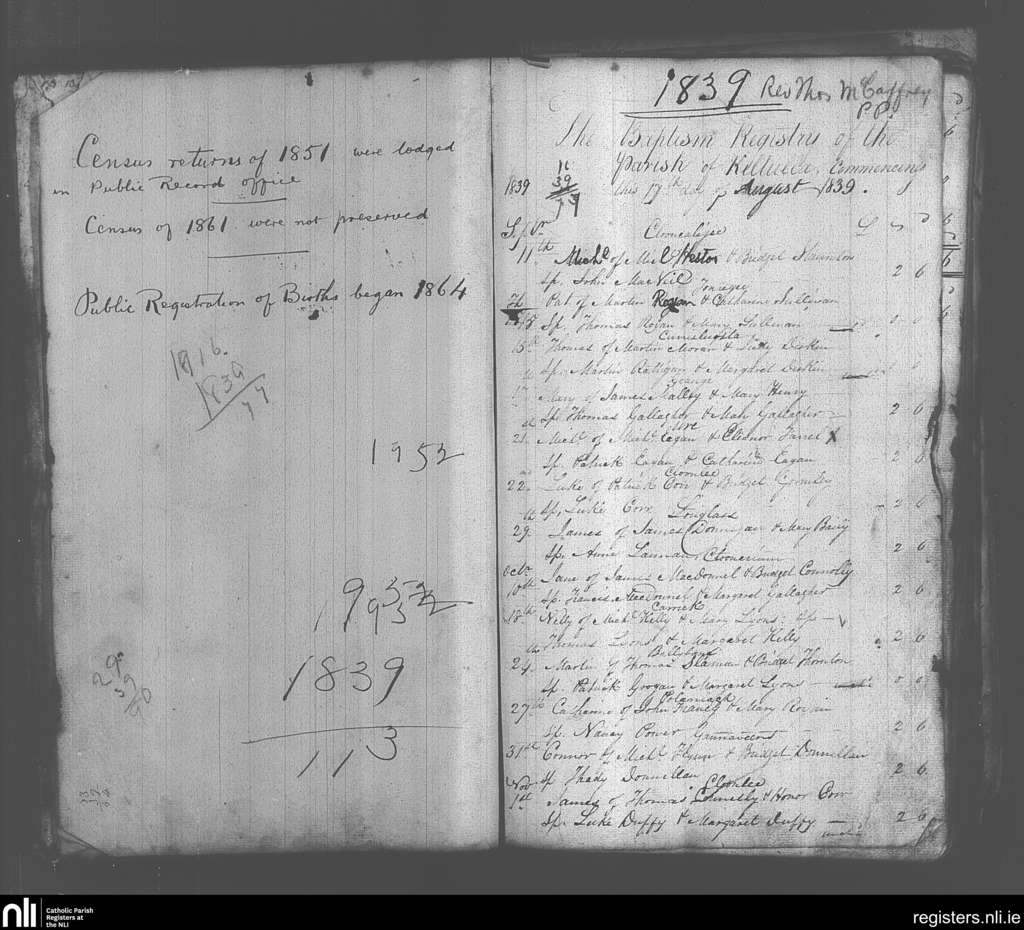 Kiltulla; County of Roscommon; Archdiocese of Tuam. Baptisms, Sep. 1839 to Nov. 1839