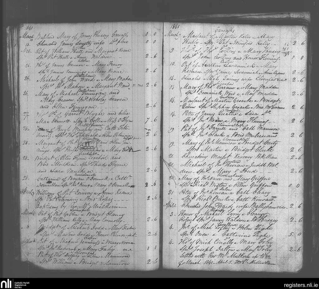 Kiltulla; County of Roscommon; Archdiocese of Tuam. Baptisms, Mar. 1841 to Apr. 1841